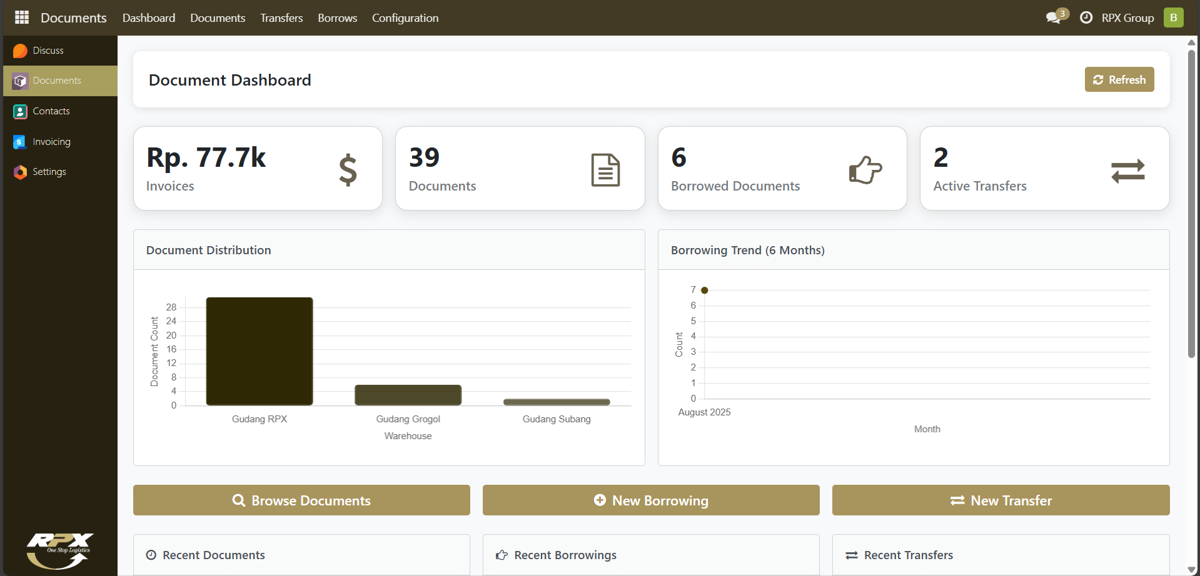 - Dashboard adalah fitur untuk menampilkan informasi ringkas dan penting terkait aktivitas dokumen. Dashboard berisi jumlah dokumen, total invoice, jumlah dokumen yang sedang dipinjam, transfer aktif, grafik distribusi dokumen, dan tren peminjaman.