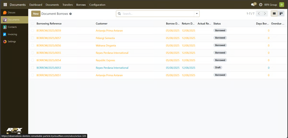 - Borrow adalah fitur peminjaman dokumen, di mana pengguna dapat meminjam dokumen dari warehouse tertentu, dan sistem akan mencatat status, tanggal pinjam, serta pengembalian.