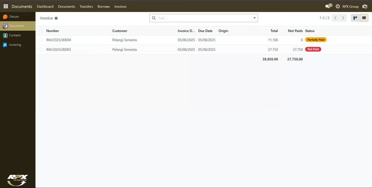 - Tombol aksi cepat untuk mencari dokumen, menambah dokumen, dan melakukan pengajuan transfer.