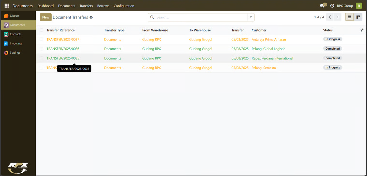 - Daftar keseluruhan riwayat transfer dokumen, baik yang masih diproses maupun yang sudah diterima.