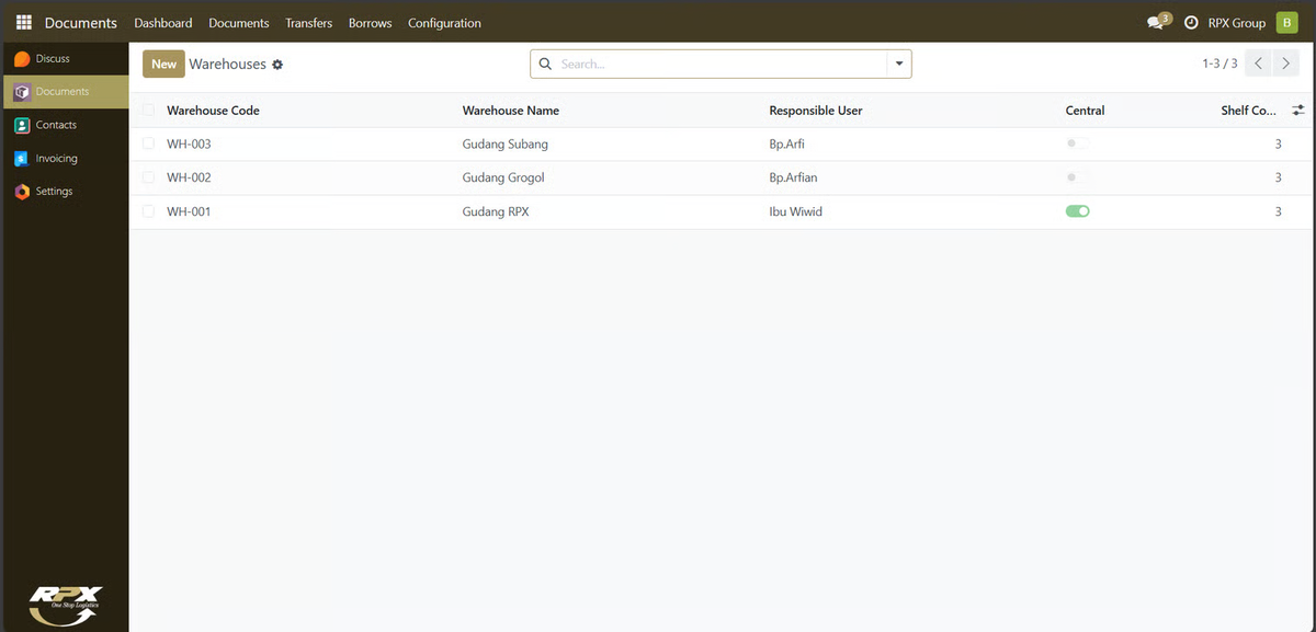 - Filter pencarian berdasarkan nama dokumen, pemilik dokumen, tahun dokumen, gudang, dan rak tempat dokumen disimpan.